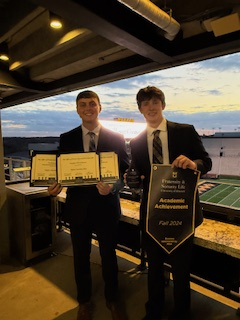 Brother Noah Graham (left), the Noble Ruler of Theta Chapter and Brother Owen Reynolds (right), VNR-Recruitment holding the four awards the chapter received early May.